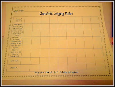 And here is our judging ballot for the chocolate party. It was fun. And I think we were happy campers all afternoon in a chocolate coma!