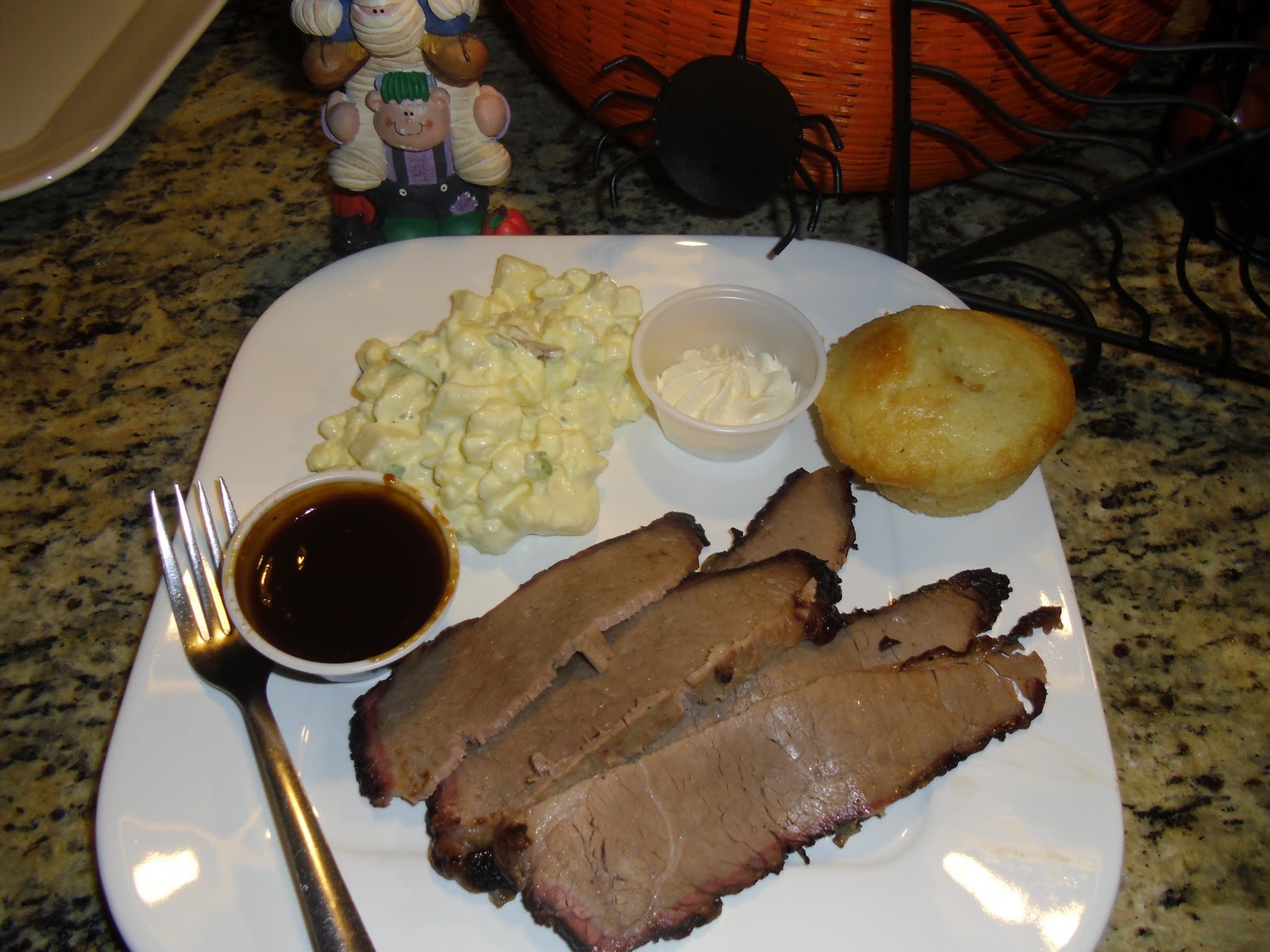 | They have the best potato salad and corn muffins….and….well…I didn’t have to make it! Here’s John’s brisket…. |
