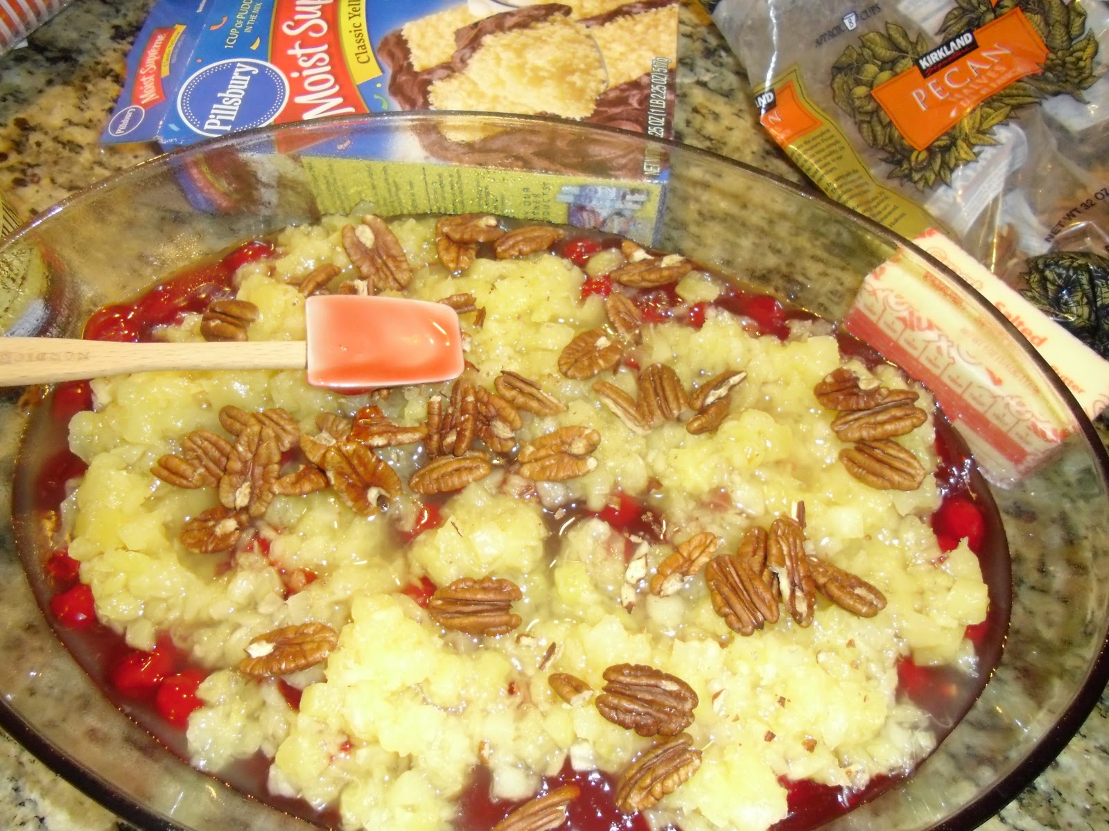 Preheat oven to 350, Spray 9 x 13 pan with Pam. spread cherry pie filling, top with crushed pineapple. Sprinkle cake mix on top and dot with sliced butter and nuts. Bake for 45 min. to an hour till golden and bubbly.