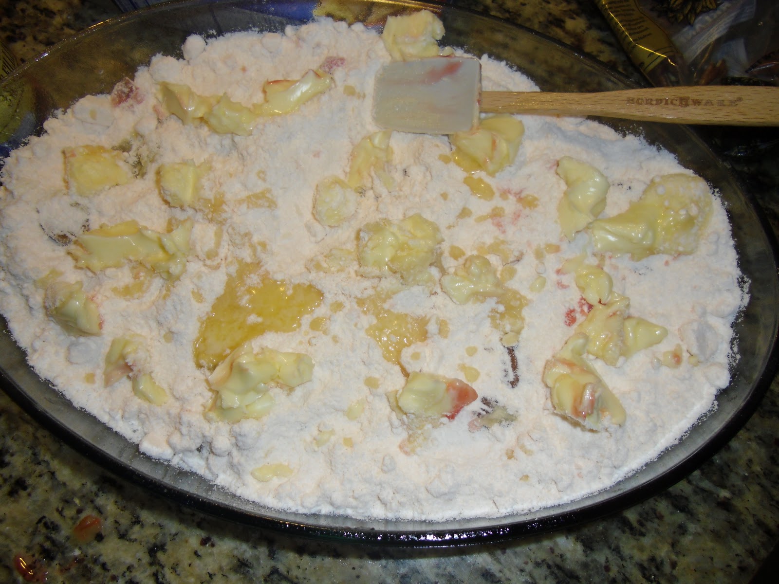 | Dump the cake mix on top and dot with butter pieces….THAT’S IT! |