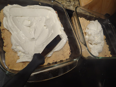 When the crust is completely cooled add the cream cheese filling on top of the crust and spread evenly.