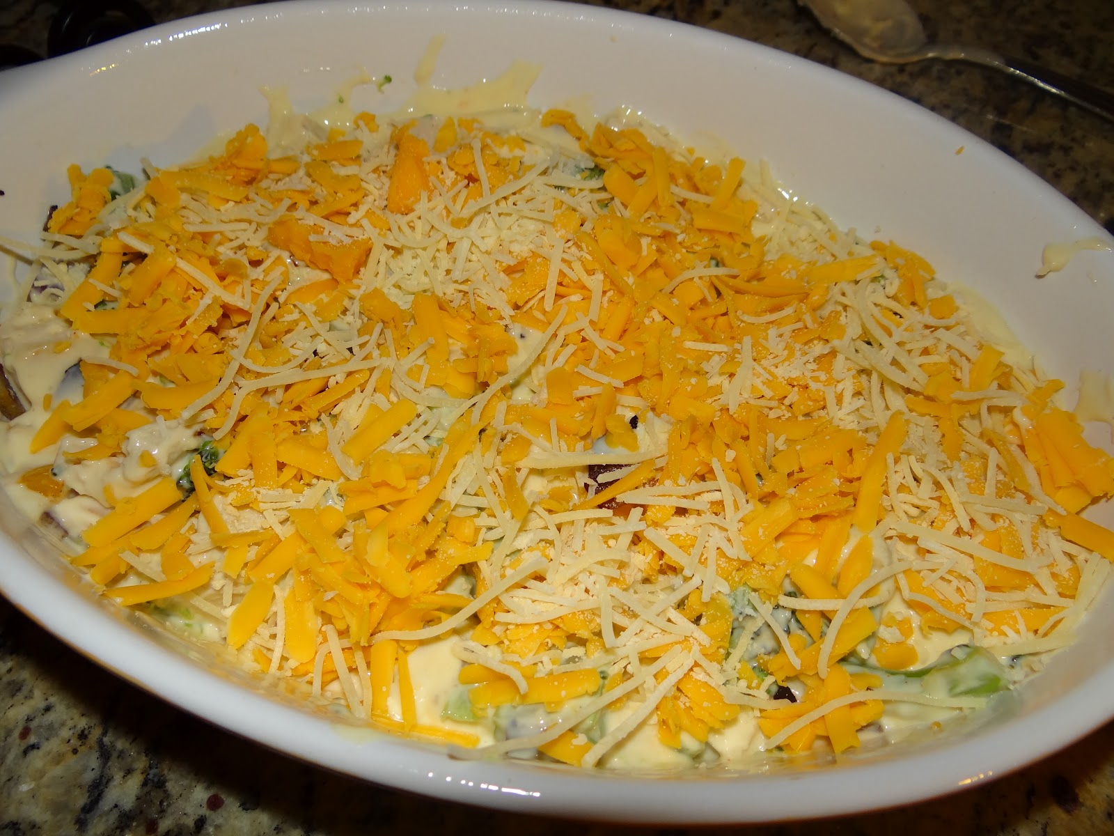 - Place the cooked broccoli in a casserole dish. Top with the grilled, sliced up chicken and grilled onions. In a bowl, mix the soup, sour cream, spices and milk, and pour over the chicken. Sprinkle with Cheddar cheese or a mix of cheeses.