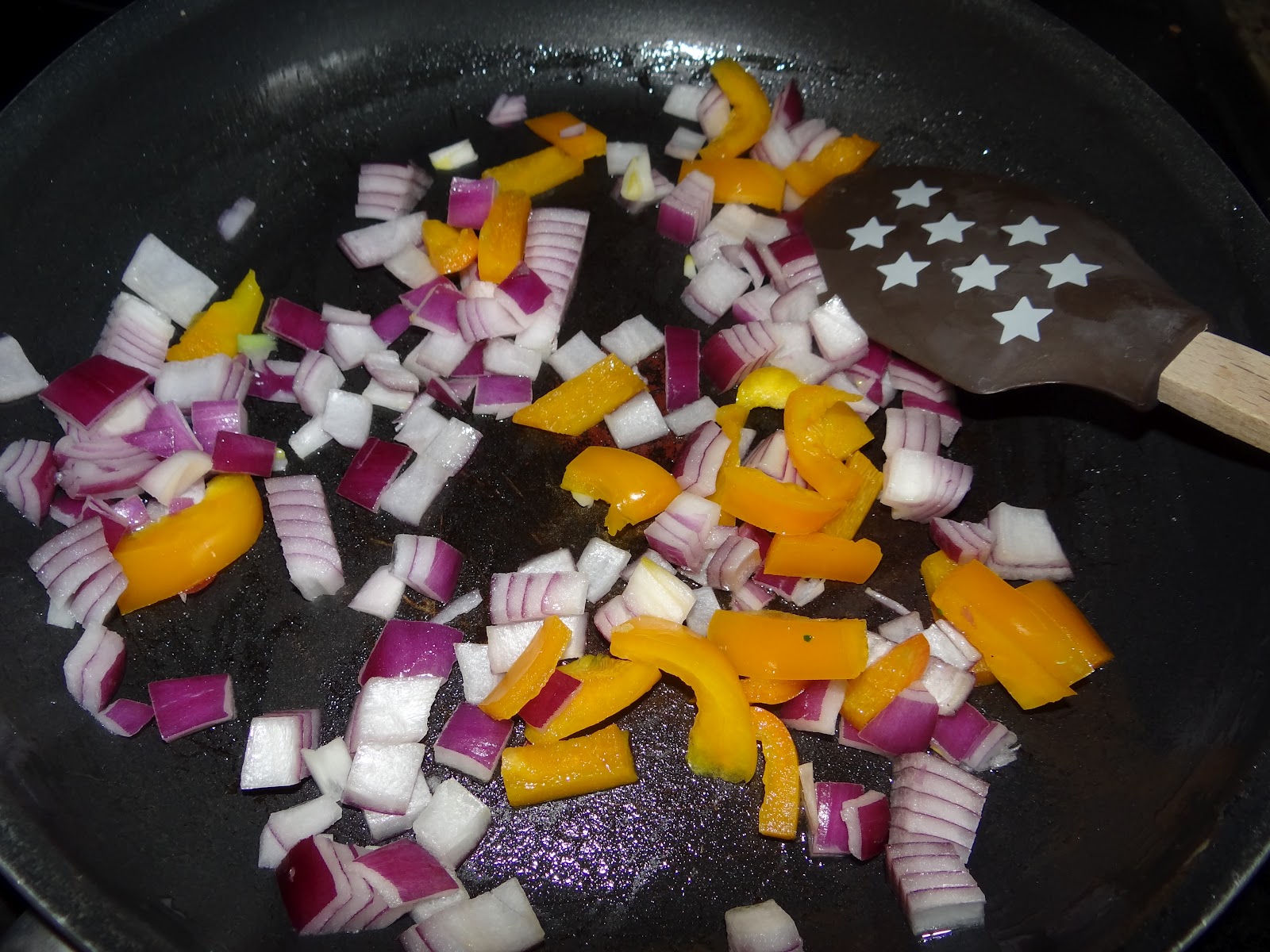 I had a bit of leftover yellow pepper, like a 2 inch x 4 inch sliver so I added that to my onions as they were sauteing just to use it up. Surprisingly it added some pretty color and yummo flavor!
