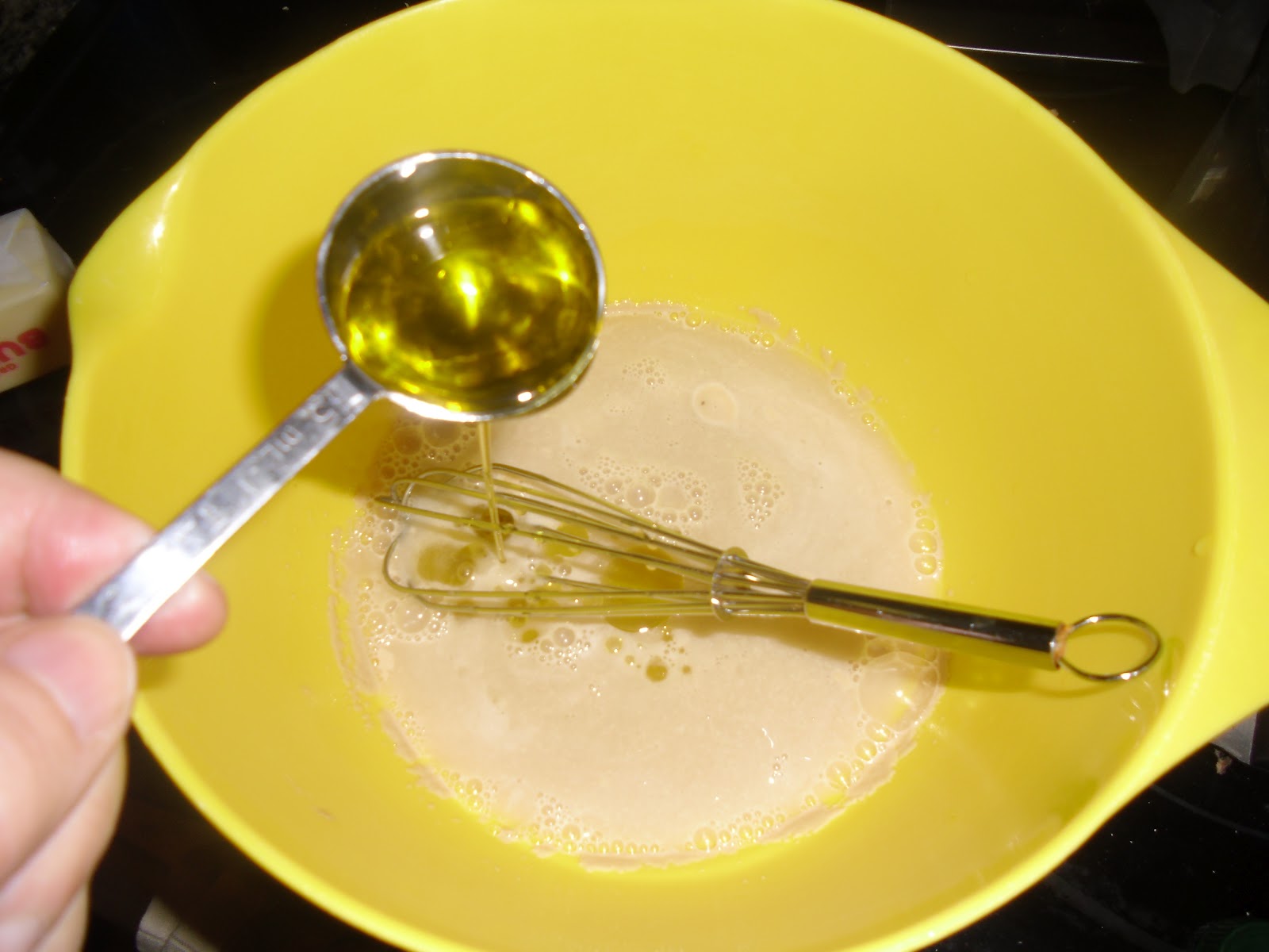 | Warm water mixed with the yeast….then add sugar after it foams up a bit…. |