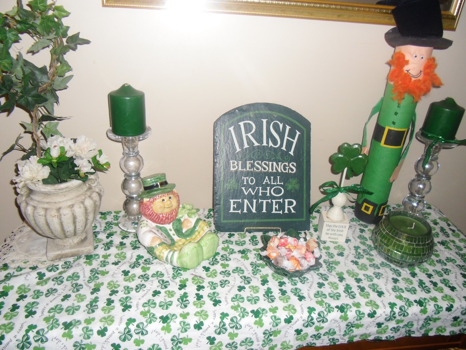 My St. Patrick’s Day front entry table….I made the leprechaun a few years back with my class. We used empty lamination rolls for the body. It took me a year to save up enough at my school! |