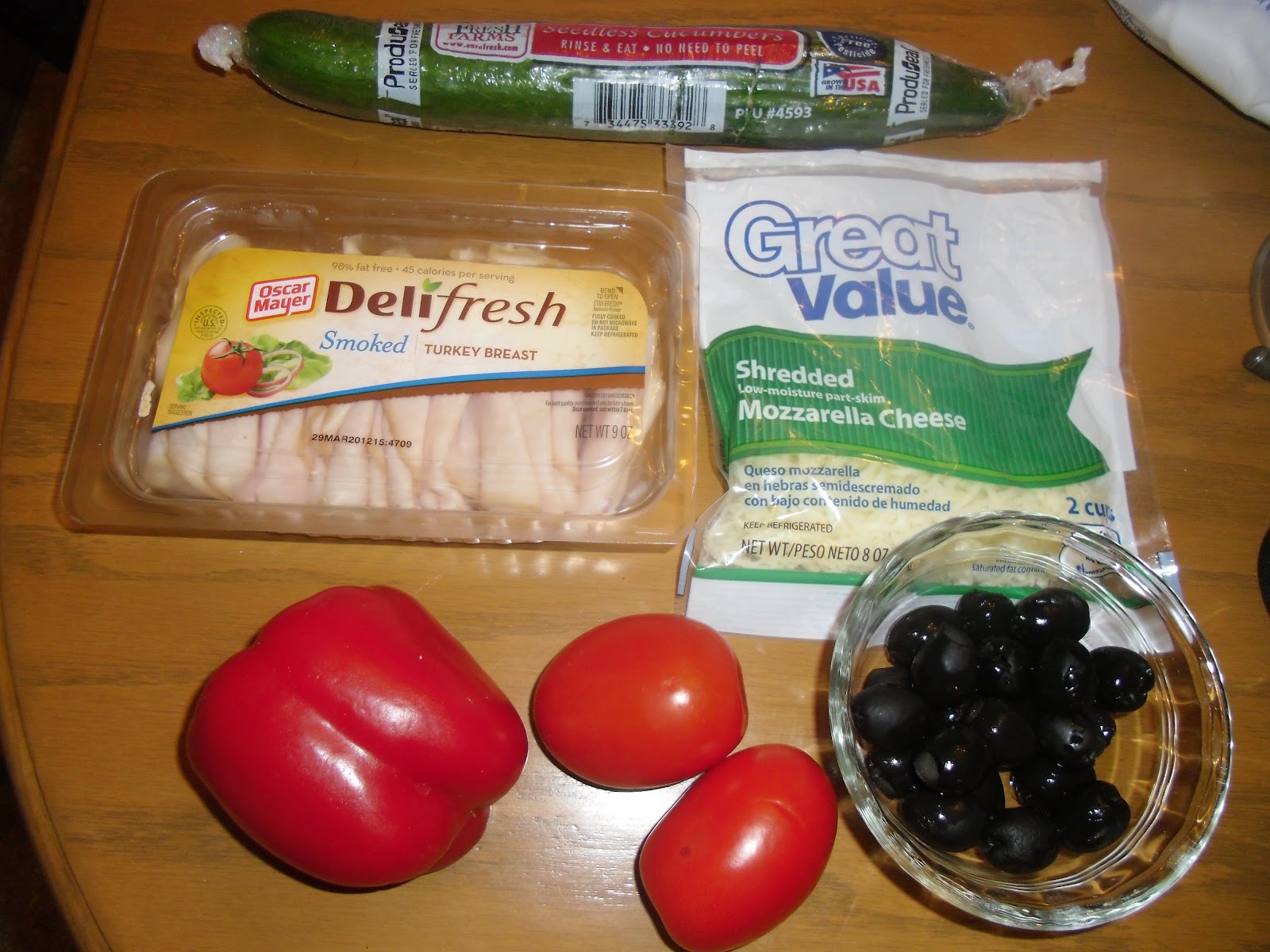 These are the ingredients in my easy and very yummy turkey wraps.  I like Oscar Meyer Deli Fresh Turkey meat because it is kind of dry for deli meat and it is smoked and delicious.  I hate deli meat that is really wet and kind of slimy, ya know what I mean?