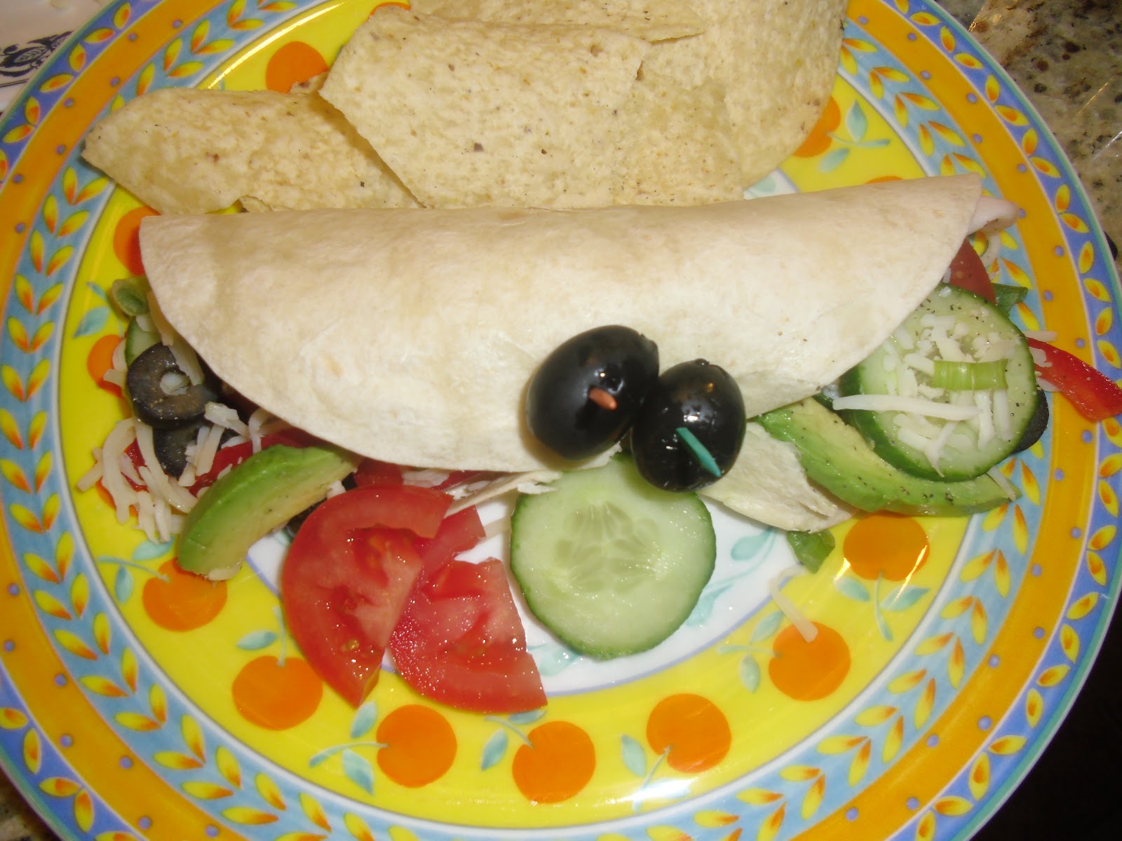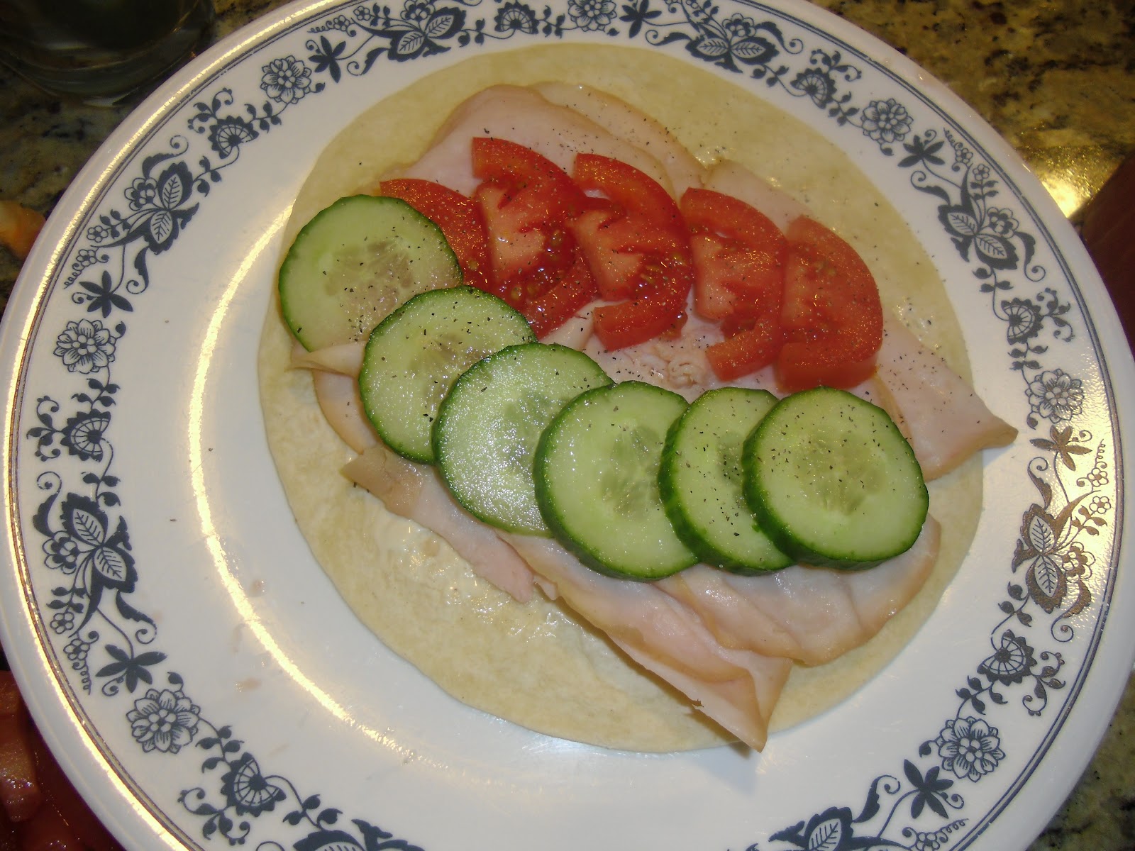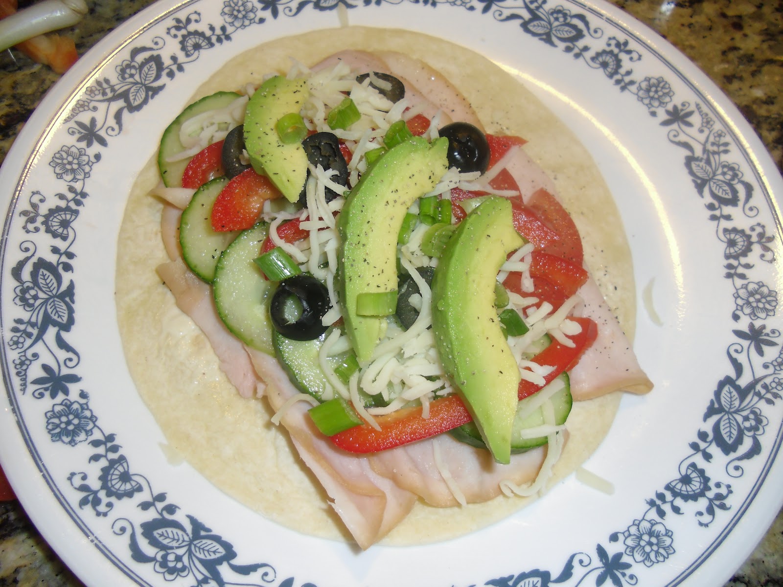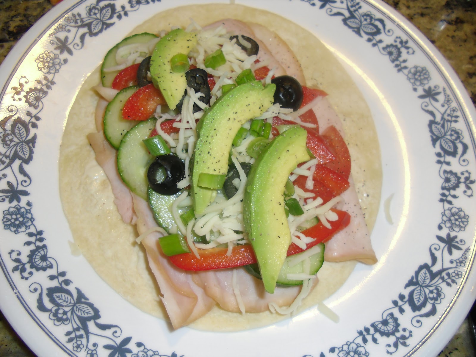 I usually buy the bigger flour tortillas that you can actually wrap around the veggies a few times. But these smaller 10 inch tortillas were on sale for $1.00 at Walmart, so...whateva…..  Spread a teaspoon (or more if you don’t have my doctor…or my lipids) on the wrap with a knife.  Then add the veggies of your choice. I add cucumbers, tomatoes, red, sweet peppers, olives and avocado, salt and pepper to the turkey. Then wrap it up!