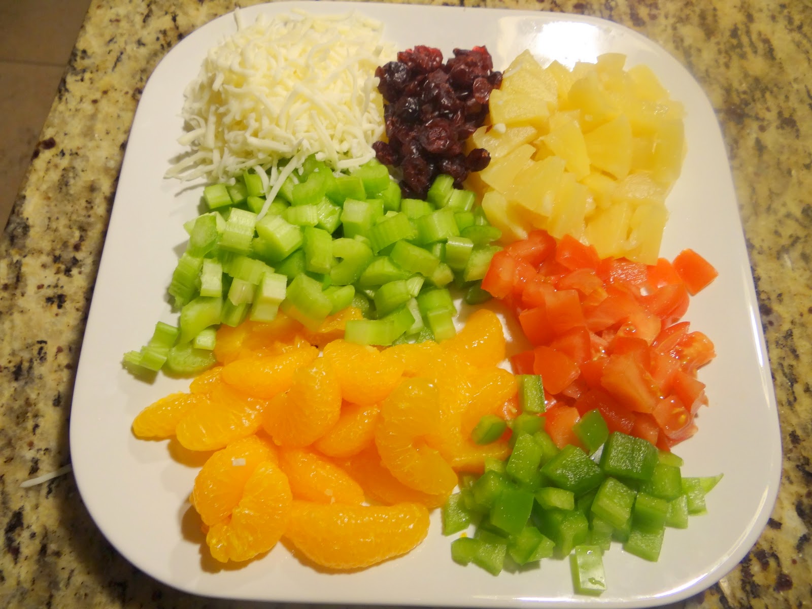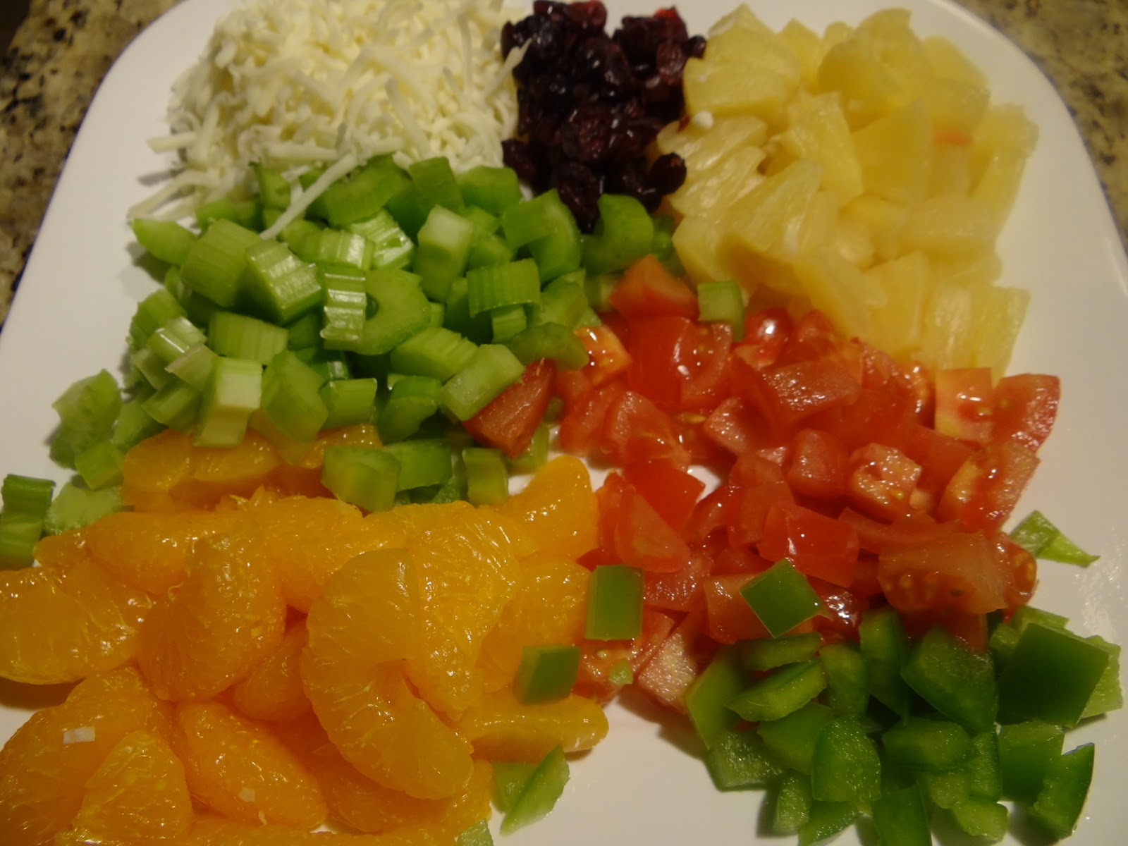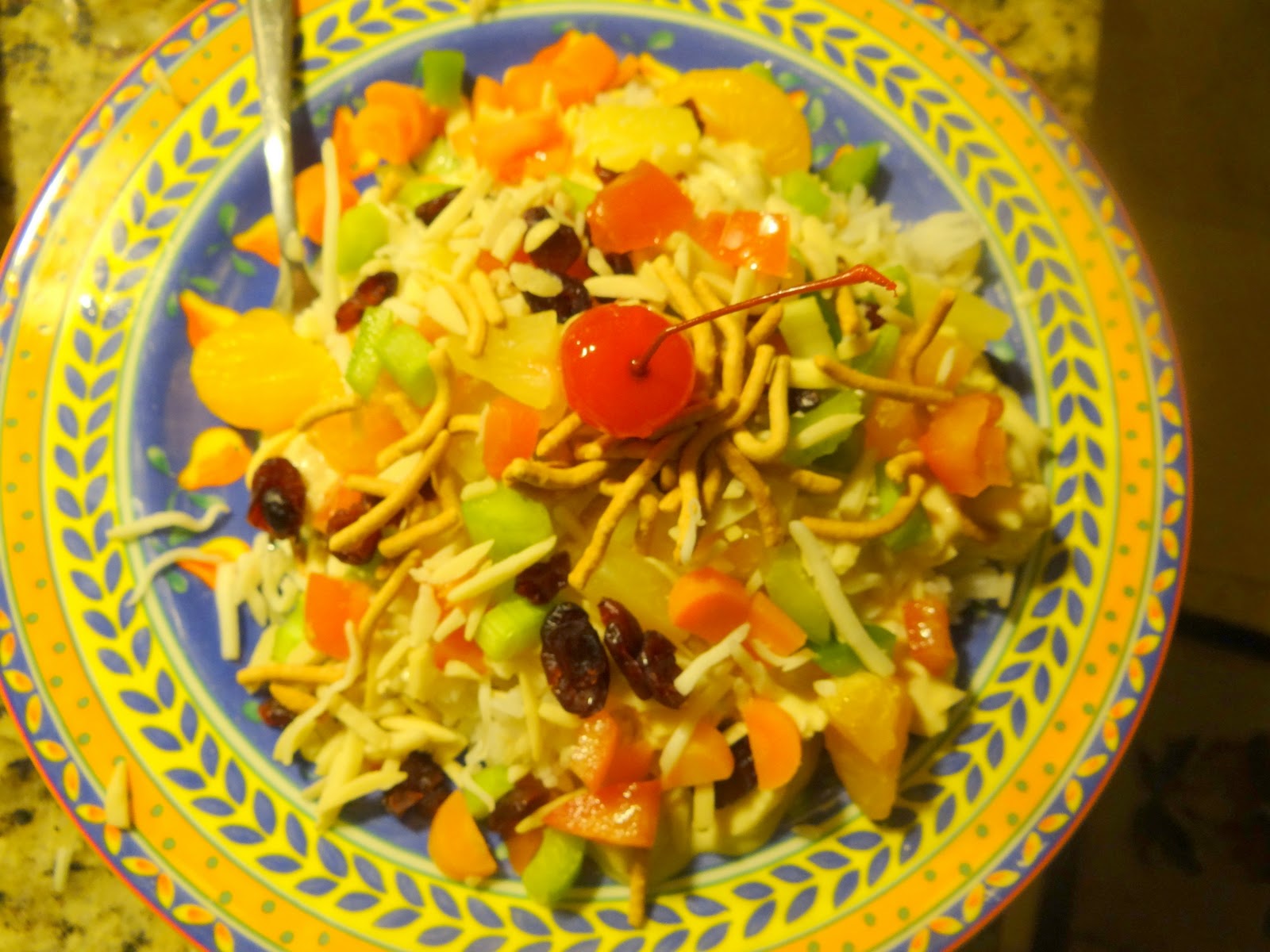 Toppings: Canned pineapple tidbits, mandarin oranges, grated cheese, slivered almonds, chopped red pepper, celery, olives, diced tomatoes, chow mein noodles.