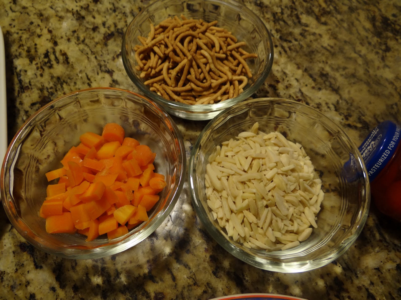 | I diced up some cooked carrots….. chow mein noodles and slivered almonds…. |