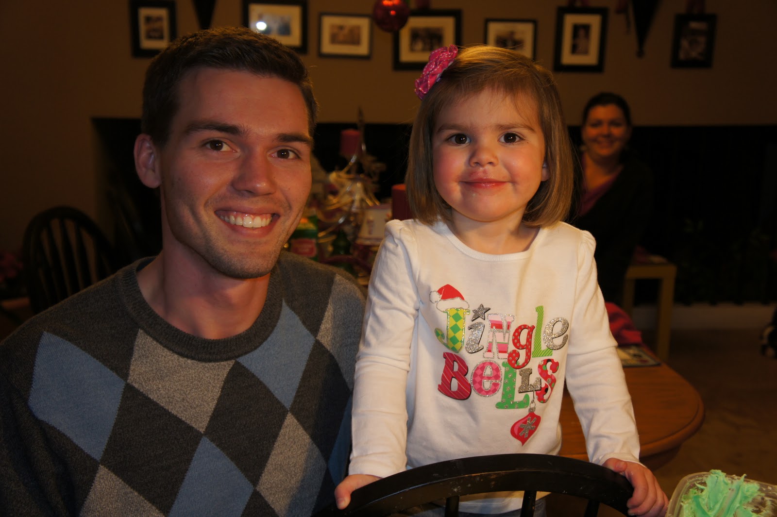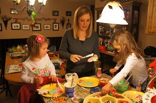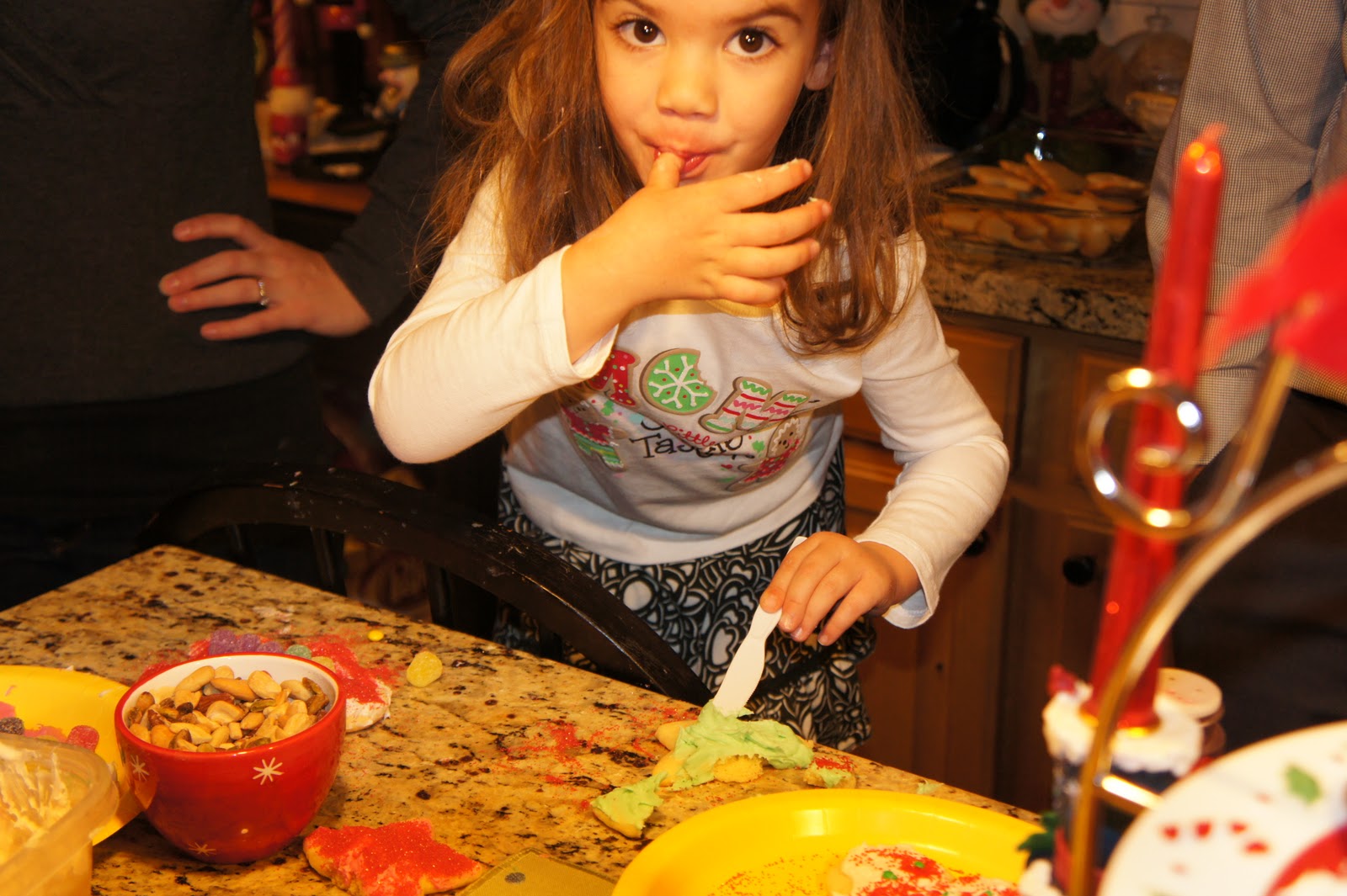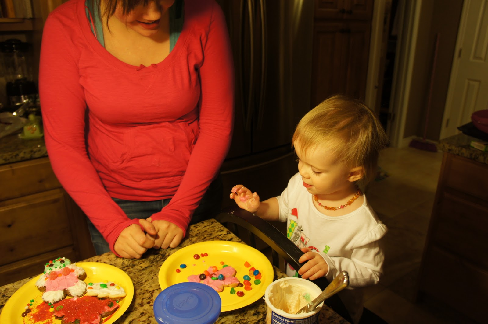 Here we are HAVING FUN WITH FOOD in the kitchen the other night. I had my family over for lasagna and salad, and then we decorated Christmas cookies with the little kiddos.