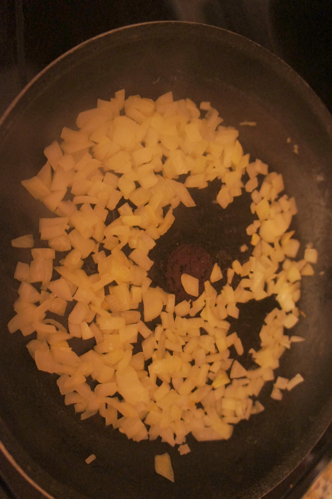I chopped up about 2 1/2 cups of white turkey meat into diced pieces. I diced up an onion and sauteed it in 2 tablespoons of butter.