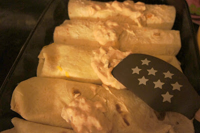 Roll up and bake in flour tortillas in a foil covered 9 x 13 pan for 30 minutes at 350.