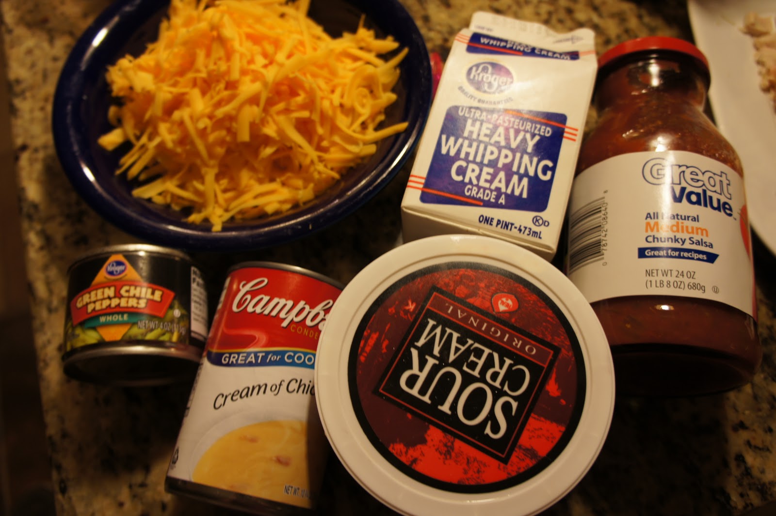 Then I added 1 1/4 cups sour cream, 1/2 cup of heavy whipping cream, 1/3 cup of your favorite mild or medium salsa, and a can of diced green chilies and a can of cream of chicken soup. Most of the time I add 1/4 cup milk to it too just so it’s nice and moist.