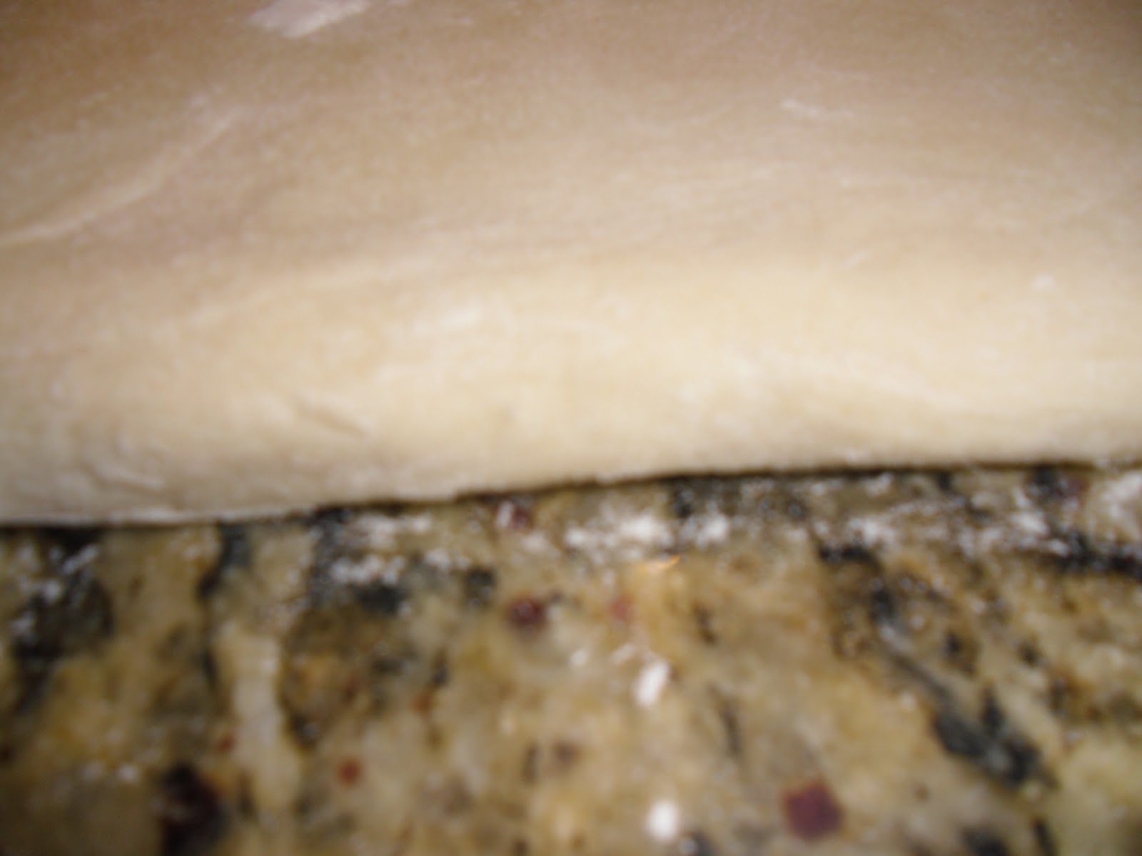 This morning I got up and it had doubled pretty good. I dumped it on my floured, granite counter top. Then I floured the top of the dough and rolled out a big rectangle (about 1/3rd of an inch thick). I cut 3 1/2 inch wide strips using a pizza cutter.