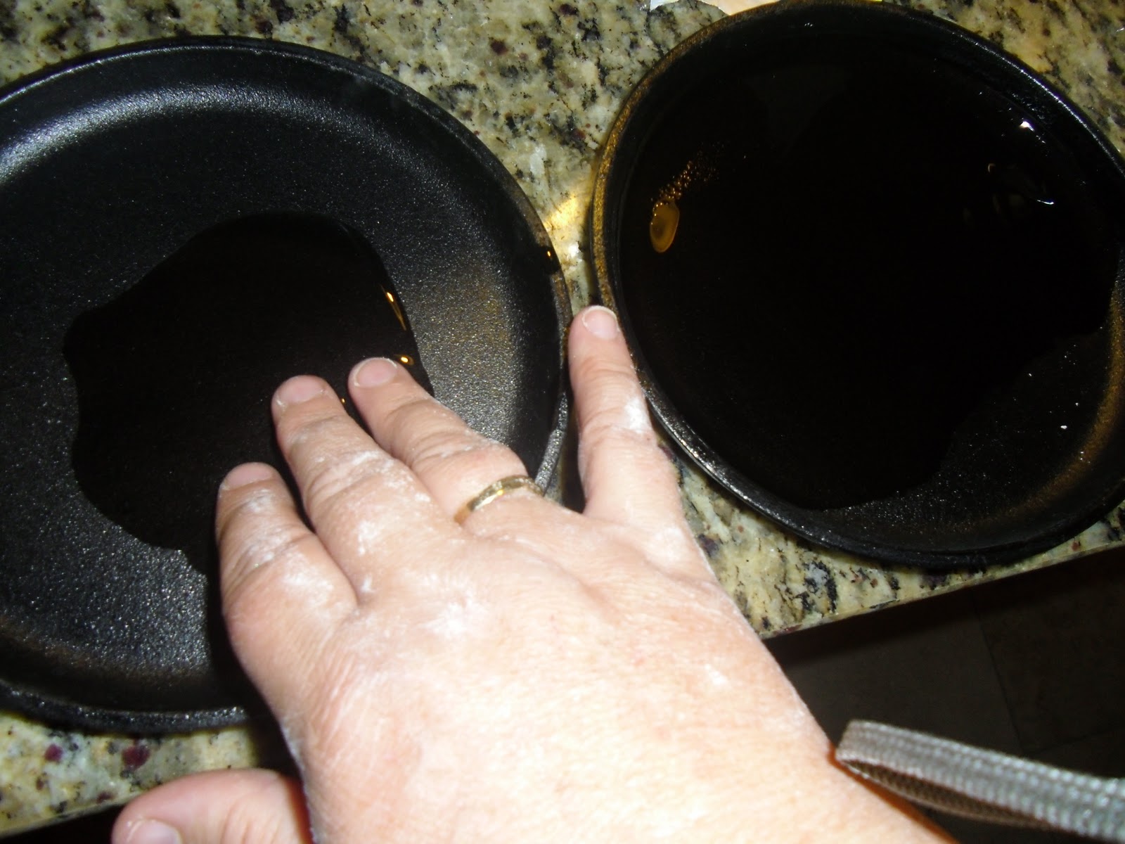 | Adding oil to my Skookie Pans for homemade Hawaiian and Supreme Pizza! |